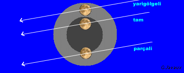 biçimine göre bu sırada ya gölgeli, ya parçalı ya da tam Ay tutulması