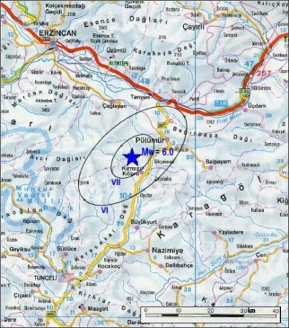 Center of Pulumur; buildings of Pulumur Security Department and Pulumur Municipality, the primary boarding school building, a bank bulding, disaster mass houses and many residential buildings were heavily damaged. 6 people injured. Saglamtas Village; 1 dead,3 residential buildings collapsed,17 residential buildings were heavily damaged Cakirkaya Village; 4 residential buildings collapsed Center of Erzincan; the building of Justice Department was damaged |
