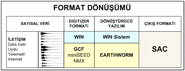 Gerek arazide gerekse merkezde sayısal hale dönüştürlen verilerin ilksel formatları kullanılan sayısallaştırıcının formatıdır. UDİM’in işletmekte olduğu deprem istasyonlarında Guralp (GCF), Quenterra (miniSEED), Nanometrics (NMX) ve Win (WIN) olmak üzere 4 ayrı sayısallaştırıcı kullanılmaktadır. KRDAE UDİM’e 4 ayrı formatta ulaşan tüm veriler, herhangibir işleme girmeden önce (gerçek zamanlı olarak), SAC (Seismic Analysis Code) formatına dönüştürülür. Format dönüştürme işlemleri için EW ve WIN Sistem olmak üzere iki ayrı yazılım kullanılmaktadır. Her iki yazılım da dönüştürdüğü veriyi kendi dönüşümlü belleğine (EW için 15 gün, WIN sistem içinse 72 saat) kaydeder. Format dönüşümünün temel amacı verilerin bir örnek olması ve aynı anda değerlendirmeye sokulabilmesidir.