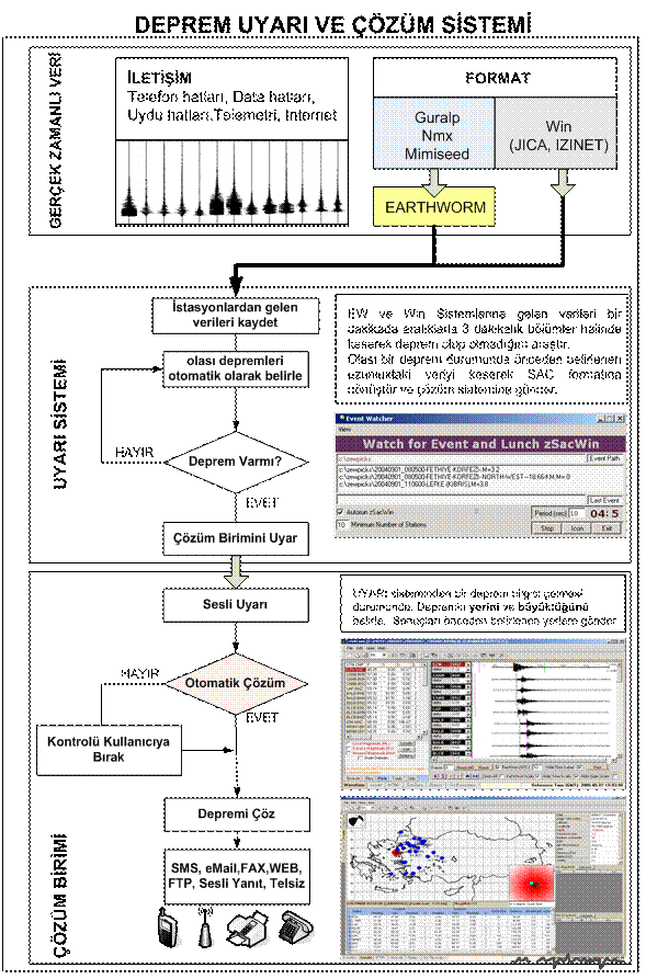 Parametrik Veri Dağıtımı: Gerek otomatik çözüm gerekse kullanıcı denetiminde yapılan çözümler sonucunda belirlenen deprem bilgileri SMS, Fax, eMail, Telsiz, Web ve Sesli Yanıt Sistemi olmak üzere 6 ayrı bilgilendirme aygıtına aktarılır.