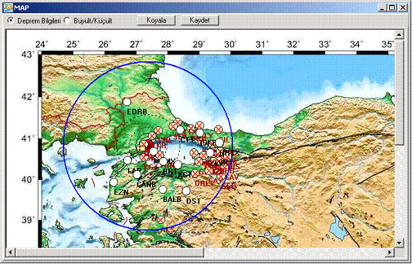 Görüntü.5. Depremin büyüklüğüne göre o depremi algılaması beklenen deprem istasyonları. Çarpı işaretli istasyonlar hızlı çözümlerde kullanılmamıştır.